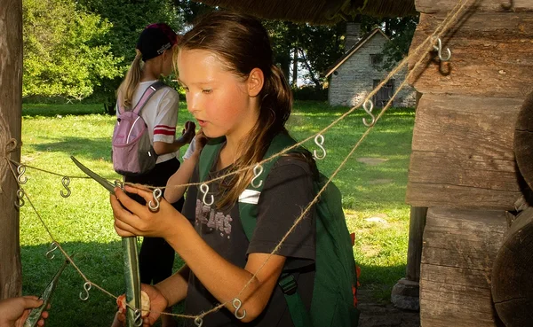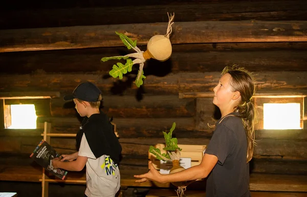- leikkisästi kokeilla erilaisia maatilan askareita, kuten hevosen valjastamista, lehmän lypsämistä, kalan suolaamista ja vihannesten lajittelua;